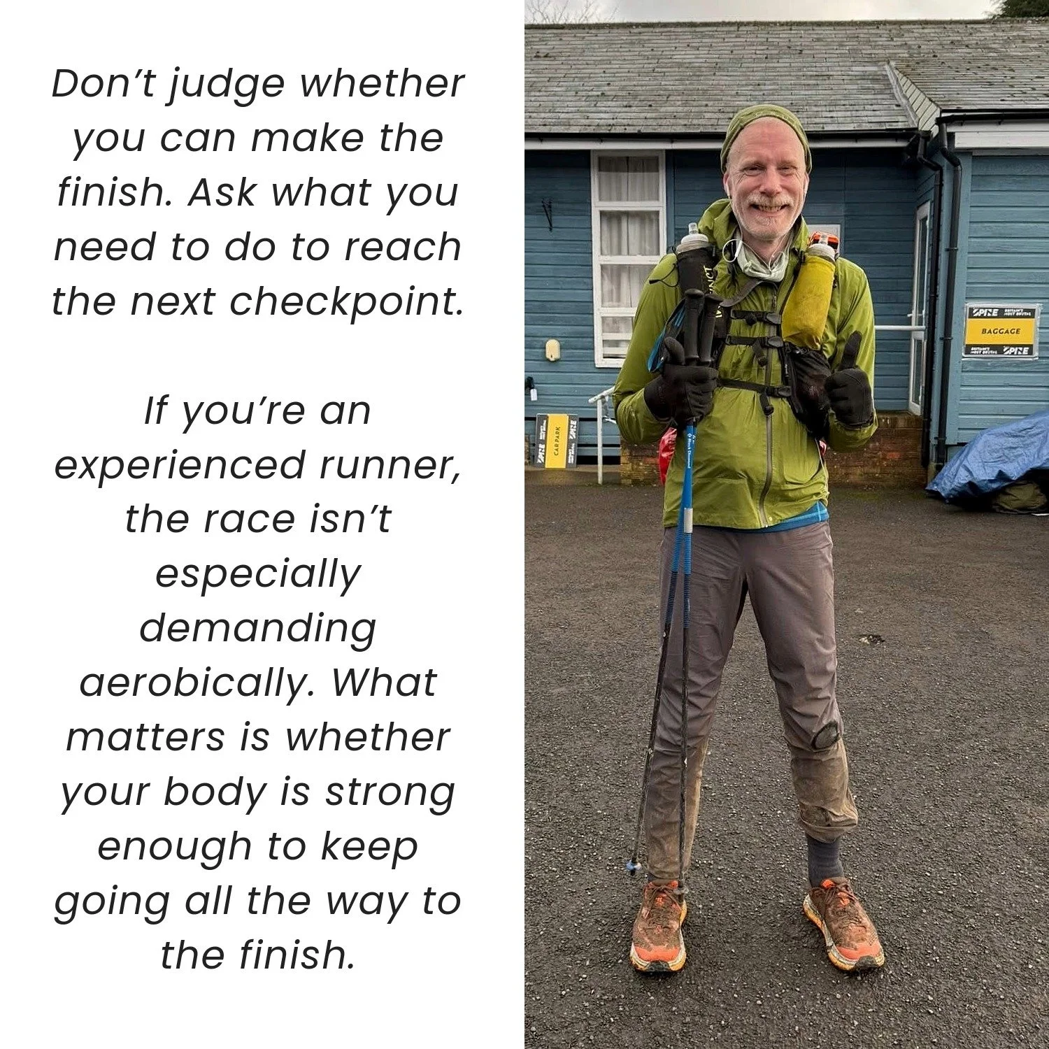 The lesson was simple - don’t judge whether you can make the finish. Ask a much smaller question: ‘Am I well enough to make the next checkpoint without doing long-term damage?’